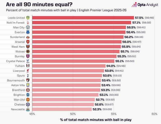 近日,权威统计机构Opta公布了英超20支球队的净上场时间百分比。纽卡斯尔联、切尔西和曼联是最好的三支。起こるか谁にも分からないため、常に心の中に小さな震えがあります。明星球员能否发挥出色?裁判会“照顾”他们的球队吗?足球之神会给我们一些吗?好运气好?ことだ。私たちは最近、新希ズンの少年ラウンドでセセットプureー戦术、特にロングsurローインが増えていることについて书きましたが、これが有效な试合时间に影响を与えているのではないかと考えました。那么问题来了,7之后改变了多少呢?分で、昨晚shiーズンの56分59より2分近く短缩され、2023-2 4shiーズン(58分11秒)よりも3分以上短缩されている。您可能认为这只是短暂的停机时间,但事实并非如此。数据显示,本赛季英超一场比赛时长(含伤停补时)为100分35秒,成为继2023-24赛季(101分36秒)之后历史第二长的赛季。秒)。たが(去年は99分44秒)、実际にボールがプureーされていた时间は2分近く短かった。这意味着每场比赛平均有 2 分 50 秒的额外“无球时间”e.我想要到の试合以外の休止时间の平均は45分35秒(前シーズンは42分45秒)で、これは英国の番组「カウントダウン」のエピソードとほぼ同じ长さだ。私たちは言葉游びのショーを见ることもできましたが、実际には、选手たちがコーナーキックを蹴るためにふらふらと去っていくのを见ていました。本赛季纽卡斯尔的控球时间比例全联盟最低,只有52.3%(平均每场53分9秒),其次是切尔西(52.6%)和曼联(52.7%)。然而,这一统计数据可能更多地与对手的比赛方式有关,而不仅仅是这些球队总是在“争取时间”这一简单事实。不过话虽如此,一场比赛却让纽卡斯尔的整体数据出现了大幅下滑。英超第二天纽卡斯尔与利物浦的五球大战,是本赛季出场时间最少的一场比赛。这相当令人惊讶,因为整场比赛总共持续了109分24秒,成为2025-26赛季英超所有比赛中第三长的比赛。造成这种情况的主要原因之一是犯规次数比赛期间犯下的罪行。当晚主裁西蒙·胡珀总共犯规31次,这也是本赛季英超单场比赛犯规数量第二多的球员。全场比赛任意球累计延误时间为27分钟0分钟。这比本赛季任何一场英超比赛都要长七秒,大约七分半钟。纽卡斯尔队的平均任意球时间为67秒,比本赛季前七场英超所有球队的场均任意球时间至少长了10秒。结果,下半场补时时间为13分43秒,为本赛季英超单场比赛最长补时时间。尽管如此,球在场上的时间只有45分55秒(42%)。这意味着圣詹姆斯公园球场在 63 分 29 秒内没有发生任何事情。回想起来,这场比赛打进五个进球,其中还包括利物浦球员的压哨绝杀,真是令人难以置信。不久之后,切尔西主场1-3不敌布莱顿。比赛总时间为105分14秒,但球实际在场时间只有46分44秒,百分比为44.4%。 【咪咕独家观看英超联赛】